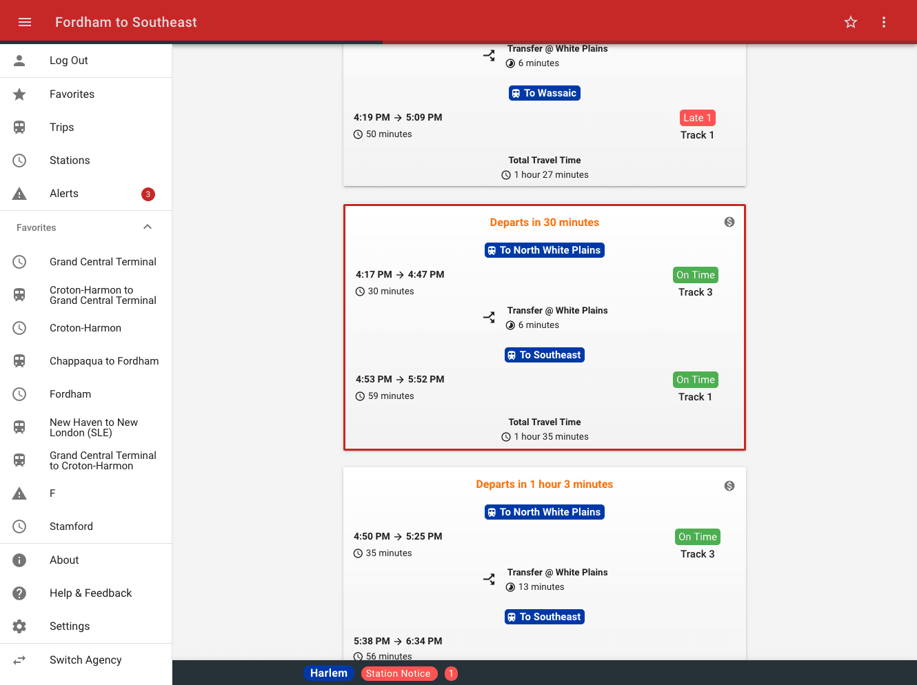 Trip Search Results between Fordham and Southeast showing a required transfer at White Plains, along with real-time status and track information